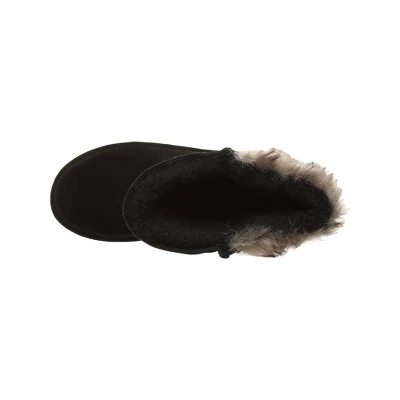 Double d-ring straps cinch the back of this smart wide width size suede boot on our new slimmer design construction with fuzzy faux fur or wool blend accented back panel. Treated with BearCoat™ Rain & Stain Repellent.