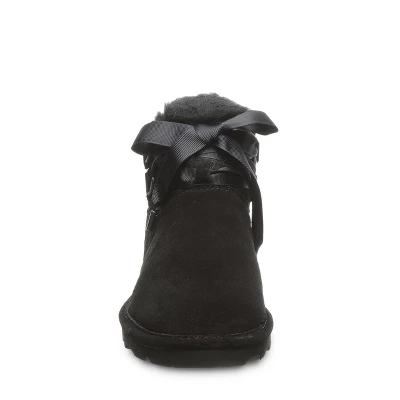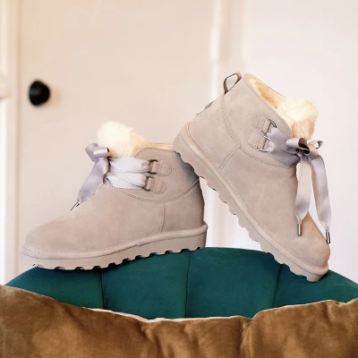 The widely loved classic suede style with a lace and bow accent for a sweet, delicate look. Thanks to the comfortable sheepskin and wool interior paired with a sturdy rubber sole, you’ll walk away with a stylish boot that has functionality and durability. Perfect for a casual day or to dress up and hit the town.